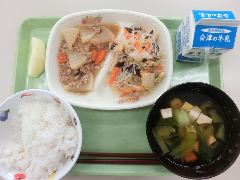 <メニュー> 麦ごはん、大根のそぼろ煮、春雨サラダ、中華スープ、りんご、牛乳