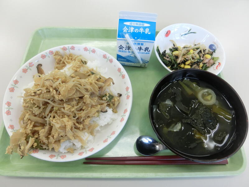 <メニュー>【日本列島味めぐり献立:京都府】 衣笠丼(ごはん)、のり酢和え、だんご入りすまし汁、牛乳