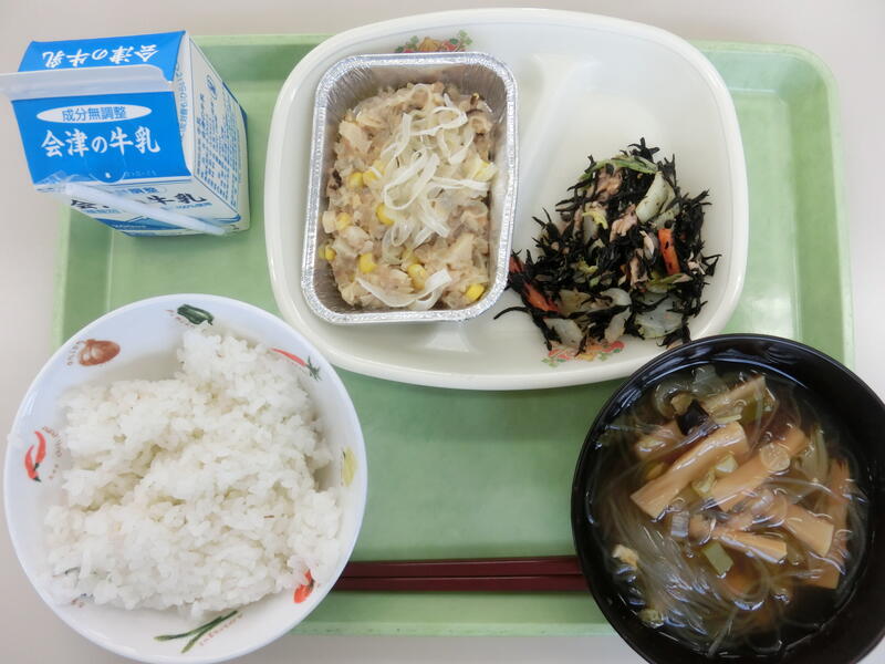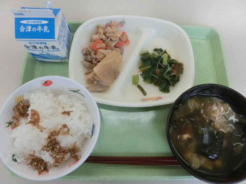 <メニュー> ごはん、車麩の煮物、茎わかめサラダ、季節野菜のみそ汁、小魚のあめ煮、牛乳