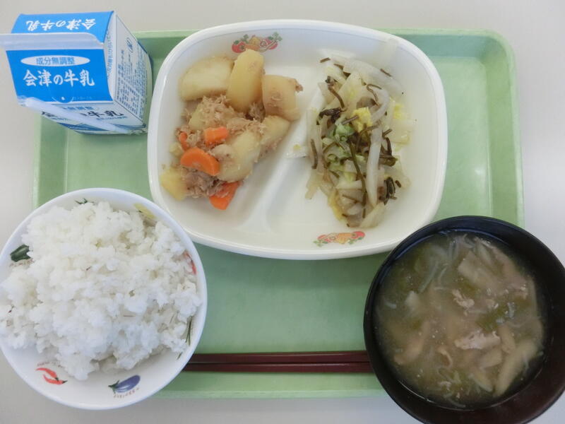 <メニュー> 麦ごはん、ツナじゃが、塩昆布和え、みぞれ汁、牛乳