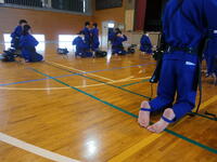 慣れない胴着つけ。冷たい床に裸足。特に1年生は初めて、2年生も1年ぶりの授業で復習からのスタートです。