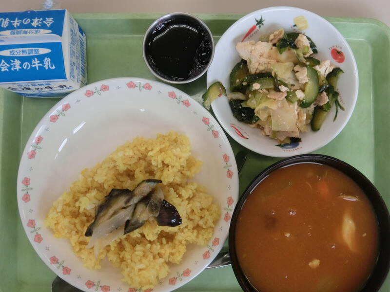 <メニュー>【日本列島味めぐり献立】北海道ターメリックライス、スープカレー、夏野菜の素揚げ、豆腐サラダ、ぶどうゼリー、牛乳