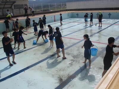 2024年6月12日 16時22分全会津中体連総合大会(3日目)に参加しない生徒と教職員により、今年度の水泳の授業に向けてプール清掃を行いました。