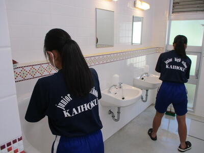 本日は晴天に恵まれ気温が上がり、暑さ指数が28(厳重警戒)にせまる時間帯もありました。測定器をプールサイドに備え、暑さと生徒の健康を注視しながら、協力し合い清掃を行いました。