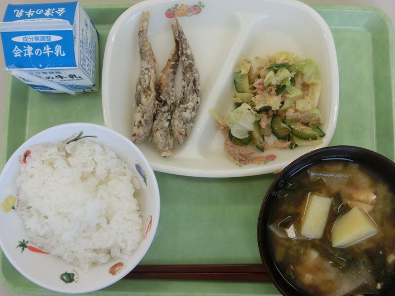 <メニュー> ごはん、めひかりのカリカリフライ、ツナサラダ、にらのみそ汁、牛乳