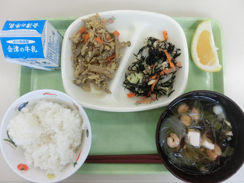 <メニュー> ごはん、豚の柳川煮、ひじきサラダ、春雨スープ、河内晩柑、牛乳