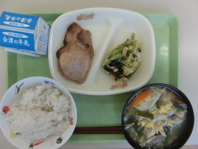 <メニュー> 麦ごはん、豚のしょうが焼き、アスパラ入りサラダ、とろりかに玉スープ、牛乳