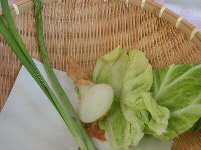 <本日のまごころ野菜> たまねぎ、キャベツ(※ アスパラガスは喜多方市内産です)