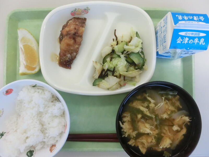 <メニュー> ごはん、あじの甘酢あん、塩昆布和え、にら玉汁、河内晩柑、牛乳