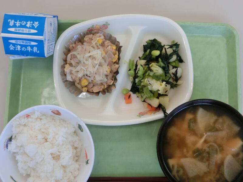 <メニュー> ごはん、花しゅうまい、彩りサラダ、みそ汁、牛乳