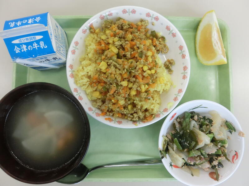 <メニュー> バターライス、ドライカレー、海藻サラダ、コンソメスープ、河内晩柑、牛乳