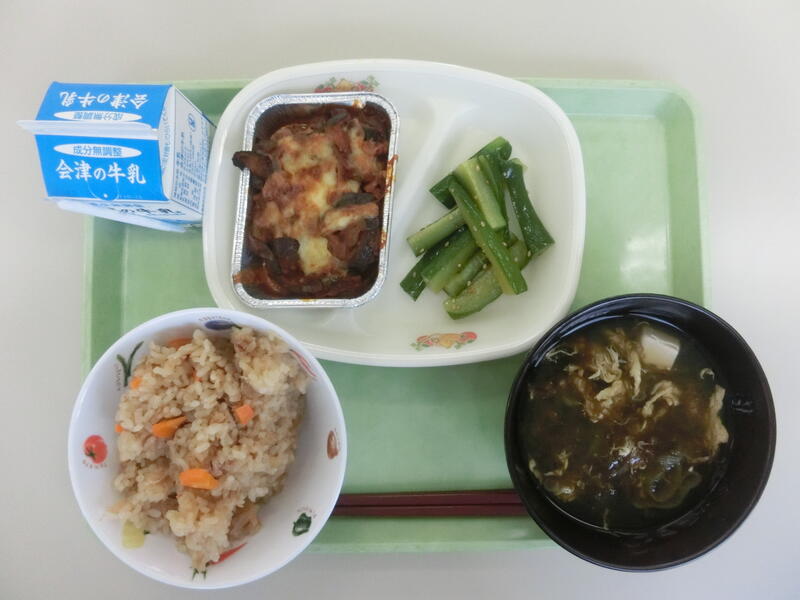 <メニュー> ツナごはん、夏野菜のトマトソース焼き、きゅうりの辛味漬け、もずくスープ、牛乳