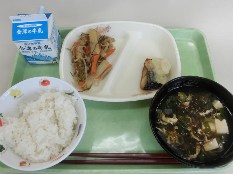 <メニュー> 麦ごはん、焼き魚(さば)、大根おろし、切り干し大根の煮物、もずくスープ、牛乳