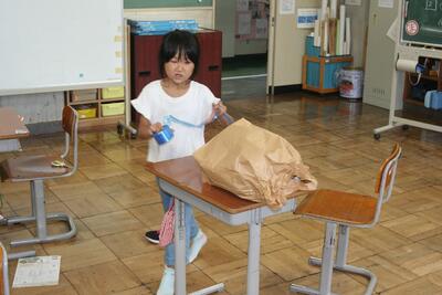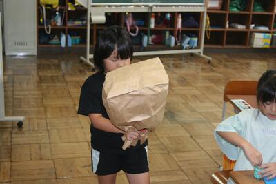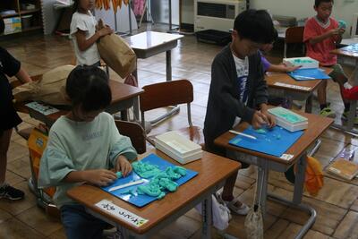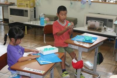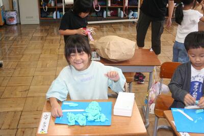 1・2年生が図工の学習をしています。1年生は「ごちそうパーティー、はじめよう」です。いろいろな食べ物の形を思い浮かべて油粘土で表します。作ったものはお皿やコップに入れて飾ります。どの作品もおいしそうです。2年生は「くゃくしゃ ぎゅ」です。くくしゃくしゃにした紙から、思いついた物を立体に表す学習です。しわをつけた紙袋を使って、何を作ろうかな。