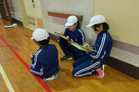 学年の違う児童が、お互いの動きを見守り、気づいたことを教え合う。
