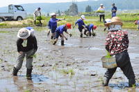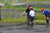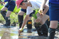 2019年6月4日 14時18分6月3日(月)、好天の中で、田植えを実施しました。5,6年生16名と少ない人数で心配でしたが、支援員の山口さん上野さんのご指導の下、学年委員さんを中心にたくさんの協力を得て無事に終了することができました。また、今回はシェフの本道佳子さんも飛び入り参加となりました。