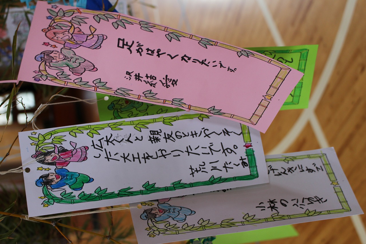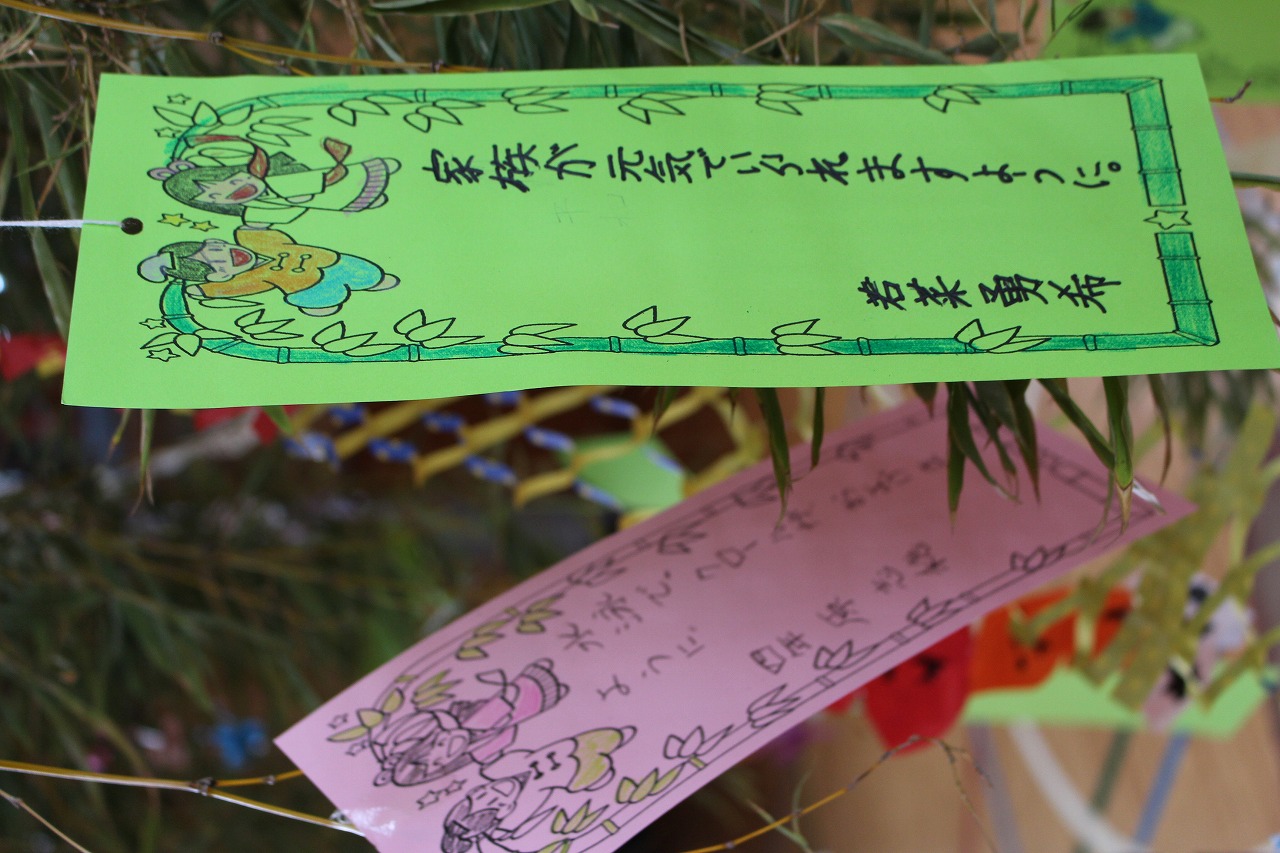 2018年7月5日 09時57分大きな竹に、短冊に願いを書いてつるしました。どんな願いがあるのかな?
