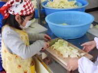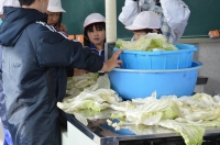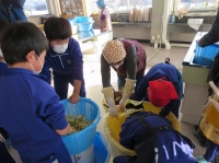 2018年1月17日 14時31分 いよいよ、3,4年生のキムチづくりが始まりました。今日は、凍えるような水道水で白菜を一枚一枚洗いました。 凍える手をアピール