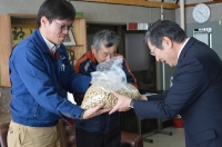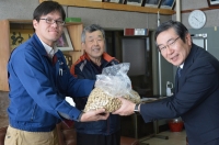 2018年1月31日 14時25分 1月31日、「おくや」の上野さんと、生産者の沢井さんがお出でになって、落花生を寄付していただきました。熱塩加納地区に落花生の工場があることから、毎年お出でいただいています。