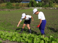 大きくなった白菜に肥料をまいた後、盛り土を行い葉っぱに残った土を丁寧に落としました。