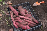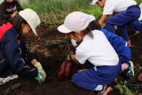 2017年10月10日 11時32分 天気が悪くなる前にと、1,2年生は、さつまいも掘りを1校時目に行いました。地中深くまで育った芋を一生懸命に掘ったり、収穫した芋を手に取ったりして、収穫のだいご味を味わいました。