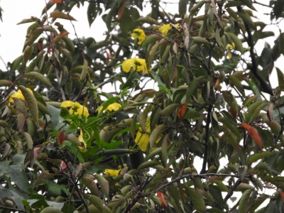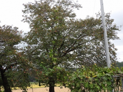 2017年10月10日 11時38分 1,2年生がさつまいも掘りをしている時に、ヘチマ畑を見ると近くの桜の木につるが伸びていて、桜の木のてっぺんほどまでに行っていました。どこまで伸びるヘチマのつる?
