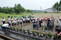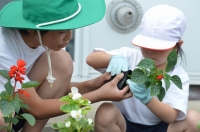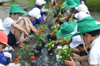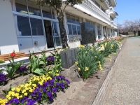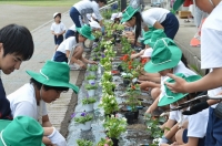 2017年6月2日 09時52分 6月1日(木)、全校生で校舎前の花壇に花の苗を植えました。ちょうど子ども達の登校を狙ったように雨が降り、登校を終えたとたんに雨がやむという不安定な天気でしたので、苗植えも一苦労でした。朝の活動の時間に予定していましたが、子ども達が外へ出たとたんにまた、雨が降り始めてしまいました。今日は無理かと思っていましたが、幸いにも、このあとは雨も上がったので、お昼のボランティア清掃の時間に急遽、花の苗植えを行いました。よかった。よかった。