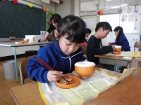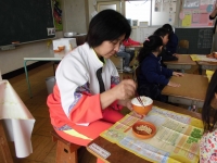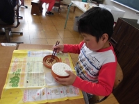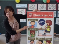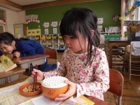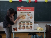 2017年5月24日 09時35分 先日、1年生7名は、箸の正しい持ち方を勉強しました。給食指導の一環として、給食センターの五十嵐栄養士さんをお迎えしてご指導いただきました。