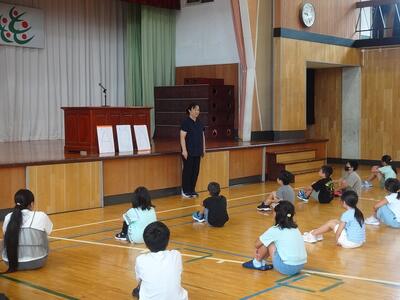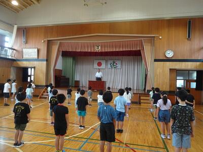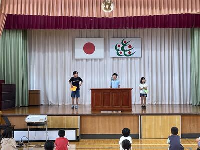代表の児童が1学期の思い出と夏休みのめあてについて