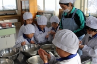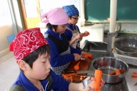 2016年1月21日 14時35分 3,4年生は、今年収穫した白菜を利用して、本場直伝のキムチづくりに挑戦しています。遠藤さん、佐藤さんのご協力を得ながら今日は、白菜とネギ、大根、にんじん、リンゴの塩漬けを行いました。