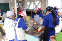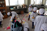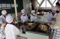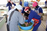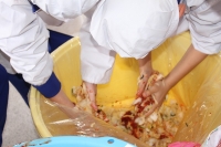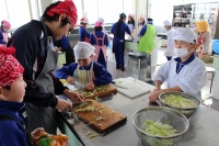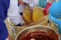 2016年1月25日 16時53分 先週、キムチづくり①をお知らせしましたが、次の日には、キムチづくり②を実施しました。魚醤(ぎょしょう)やもち米の粉、ニンニクなどを混ぜ合わせたキムチのもとに、ネギ、リンゴ、にんじんなどをさらに加えて、昨日下造りした白菜に練り込みました。