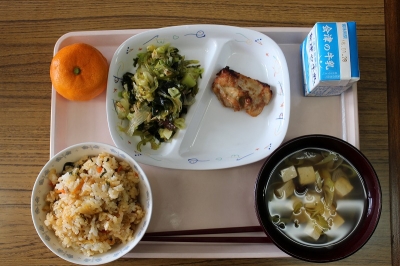 2016年1月21日 14時43分 今日の給食は、6年生の希望献立でした。「キムチご飯」「丸ごとミカン」「中華スープ」「鶏の照り焼き」などなど、