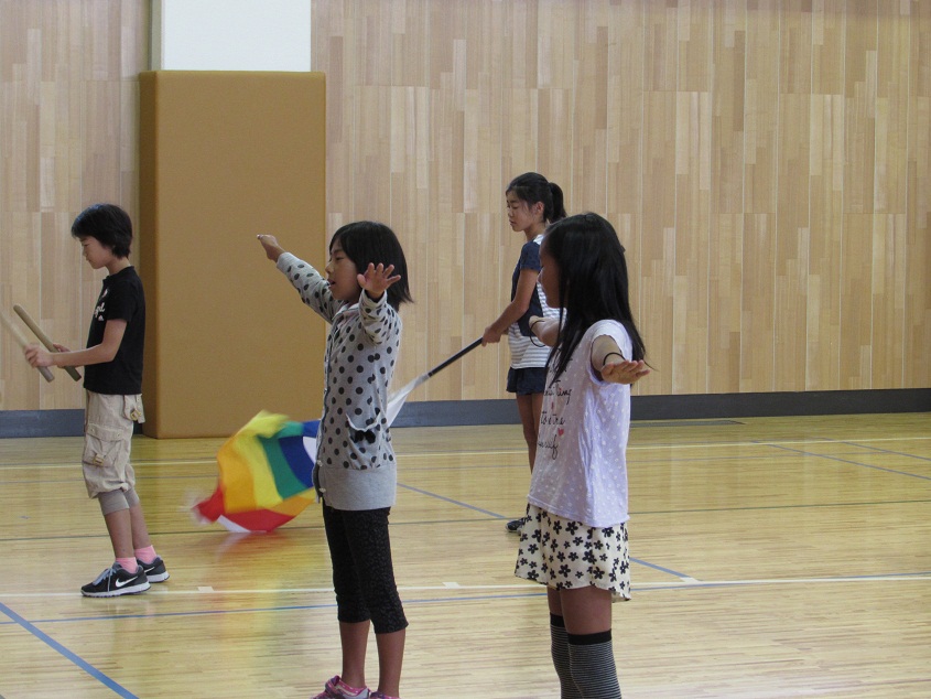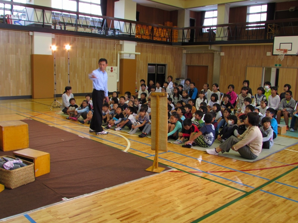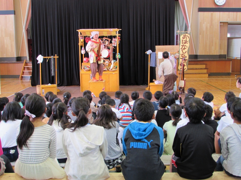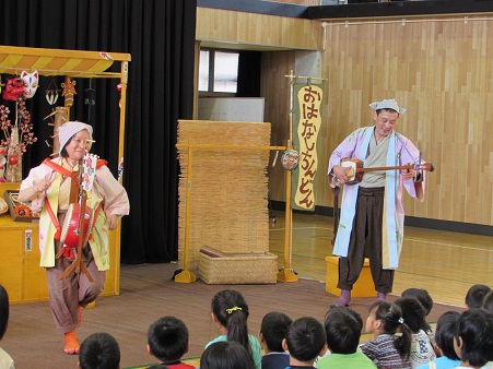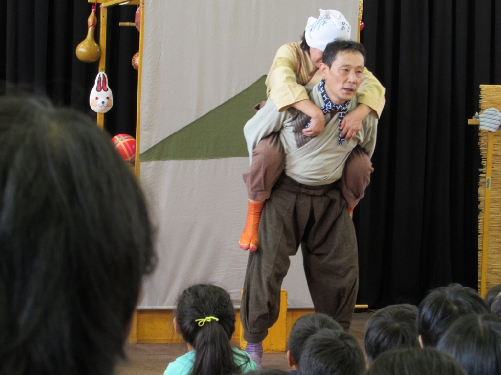 2014年9月22日 10時50分今日の2.3校時に演劇教室が行われました。劇団風の子「おはなしちんどん」です。けん玉やお手玉、竹とんぼやコマなどの伝承遊びと「にんじん、ダイコン、ごぼう、」「こもりどろぼう」「親すて山」のお話を表現力豊かに子ども達に披露していただきました。