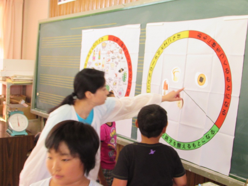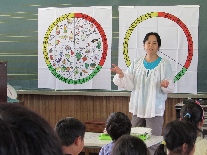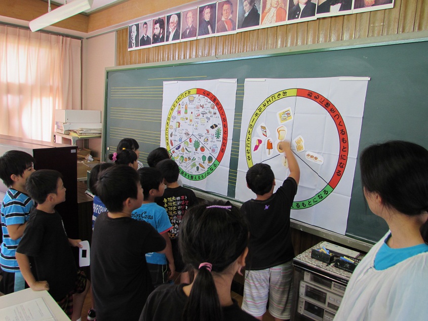 2014年9月16日 14時30分 今日の5時間目に3.4年生の食育教室がありました。「おやつについて考えよう」というテーマで日頃食べているおやつについて実際の熱量(カロリー)を計算してどのくらいどんなおやつを食べたらよいかを考察しました。指導の先生はいつもおいしい給食を作って下さる栄養士の先生でした。