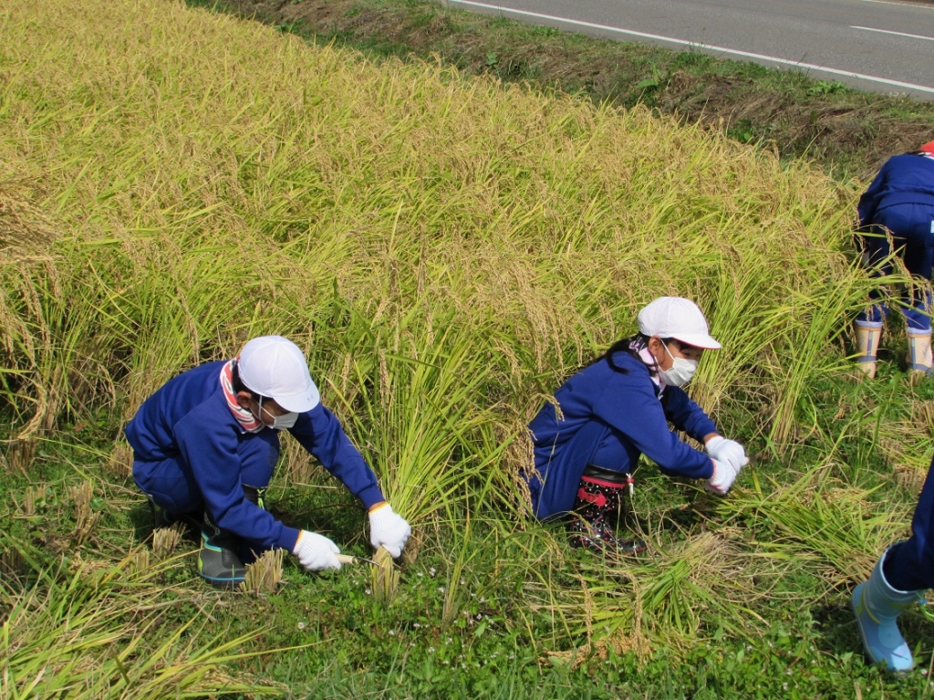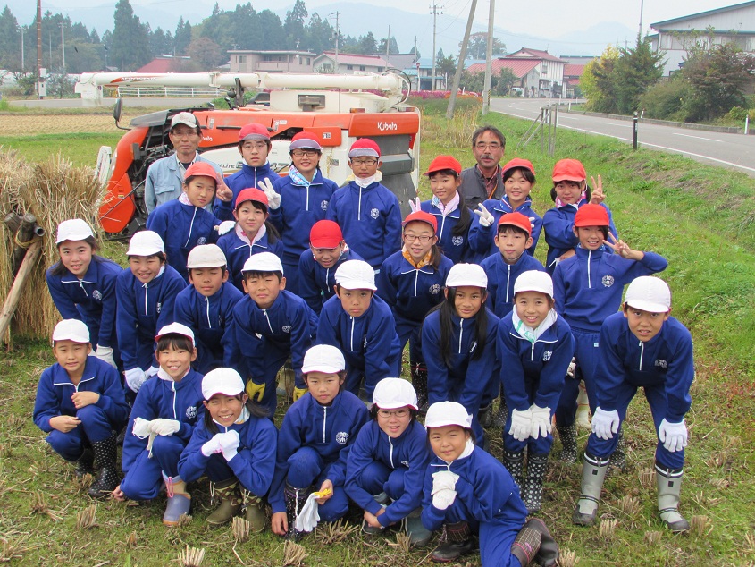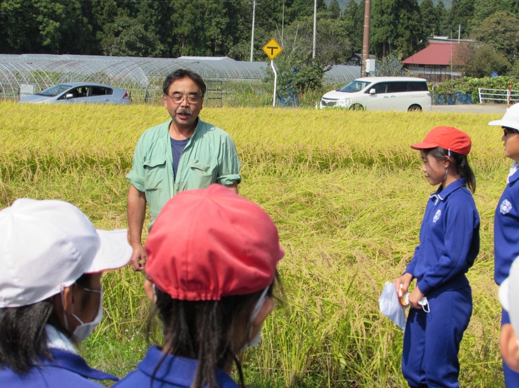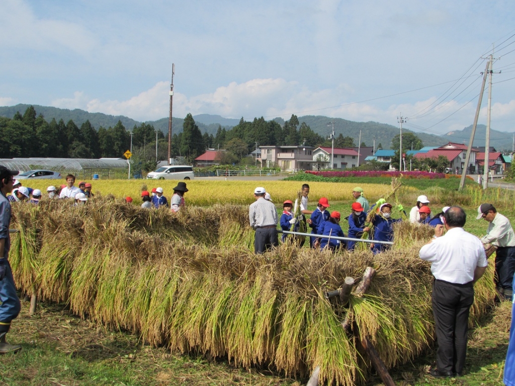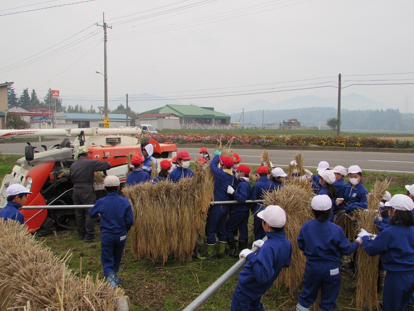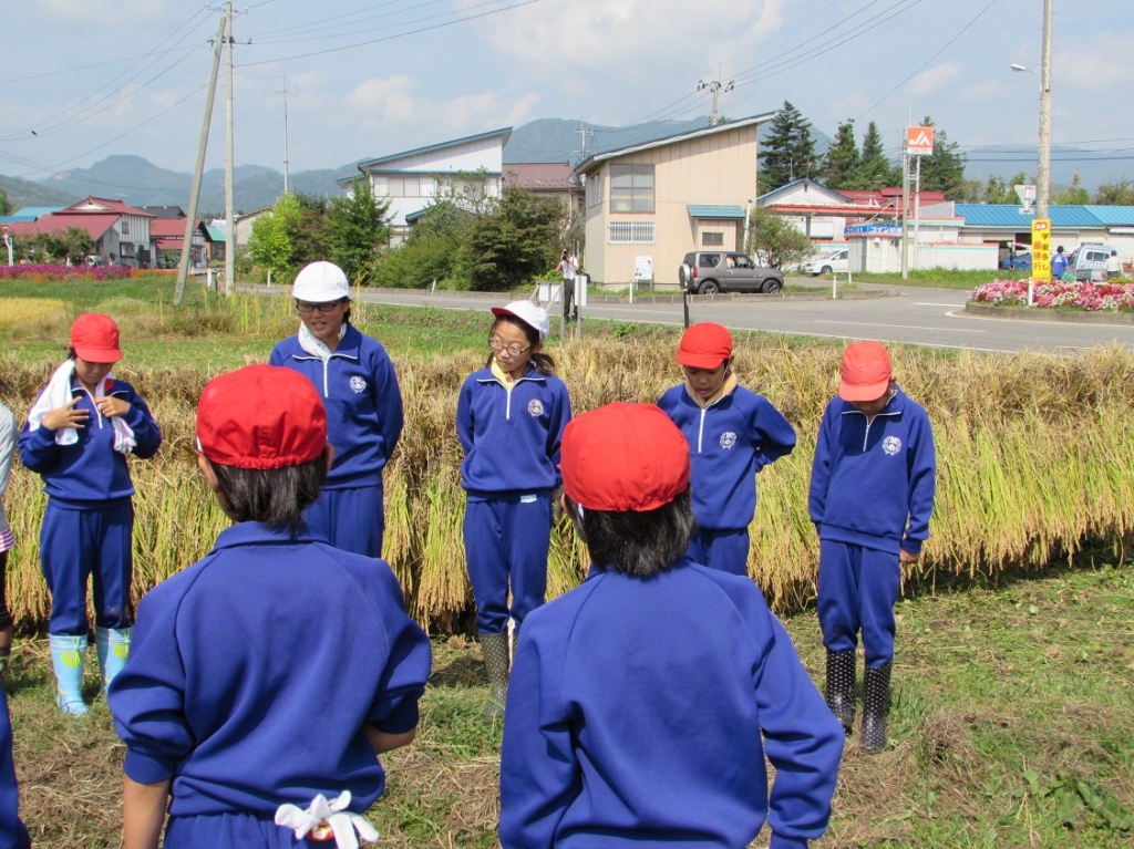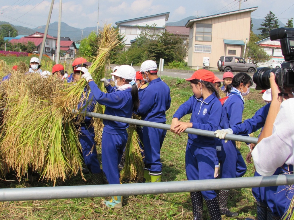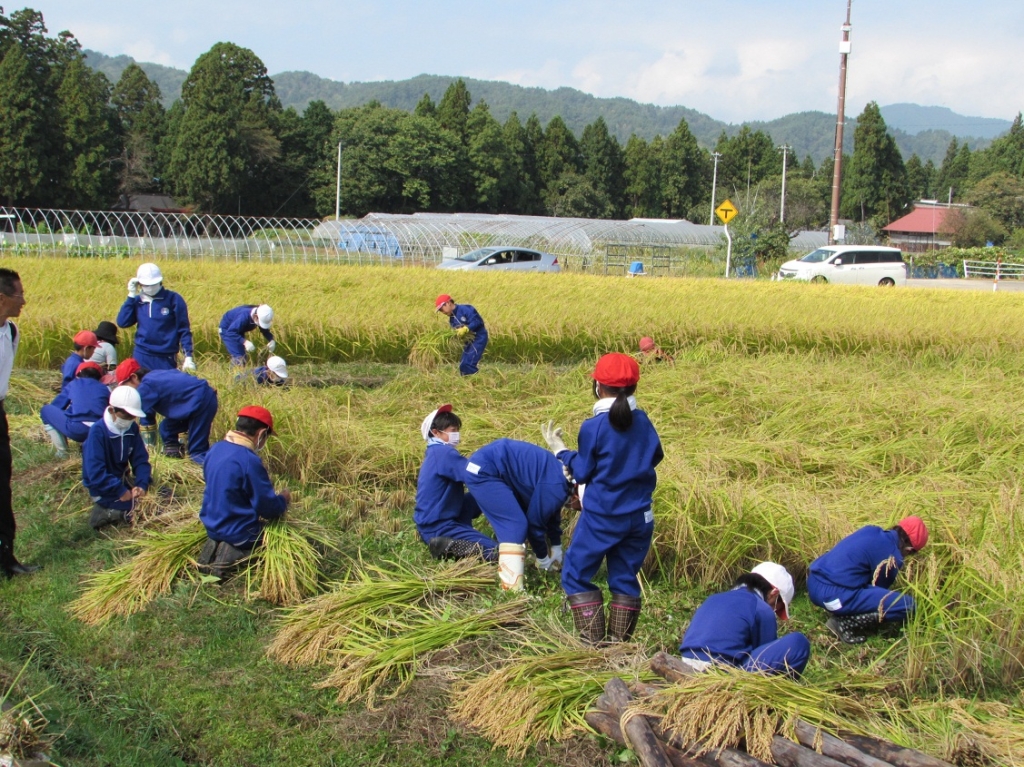 天候にも恵まれた今日の3.4校時に5.6年生による稲刈り作業が行われました。はじめに農業支援員さんからのご指導があり、6年生は昨年学んだ「稲刈りの方法」を5年生に教えてからスタートしました。5.6年生26名は、一生懸命に稲を刈り束ねていました。刈った稲は、「さで掛け」の棒につるし、自然乾燥した後に今月の21日に脱穀し、そのもち米は25日の加納小フェスティバルでおいしいお餅になり全校生で食べる予定です。