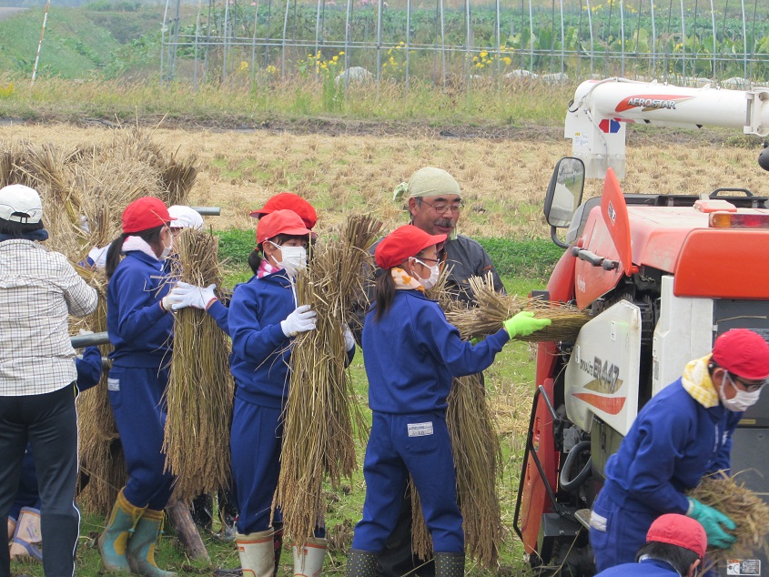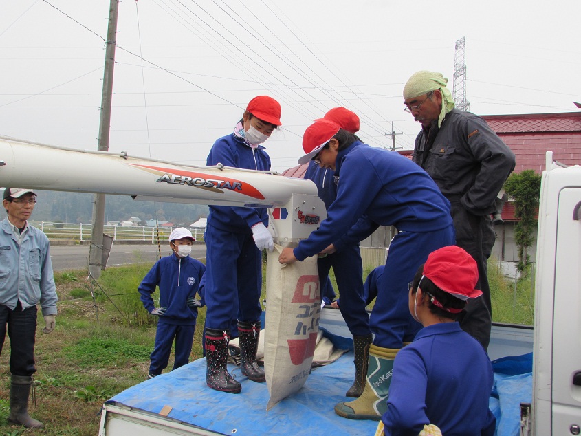 今日の5.6校時に「脱穀作業」を行いました。支援員さんの説明の後、天日干しされた稲をコンバインに運びました。5.6年生26名真剣に今年最後の作業を行っていました。最後に籾を袋詰めにして、今年の収穫の重みを実体験させて頂きました。今年の収穫量は20キロ入り袋で9袋でした。今週の25日には、加納小フェスティバルでおいしいお餅になることでしょう。