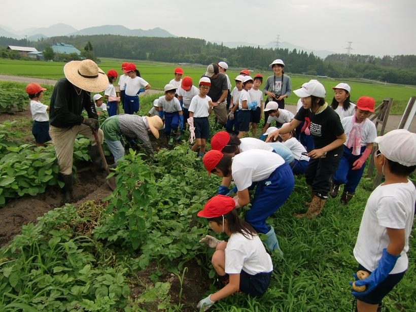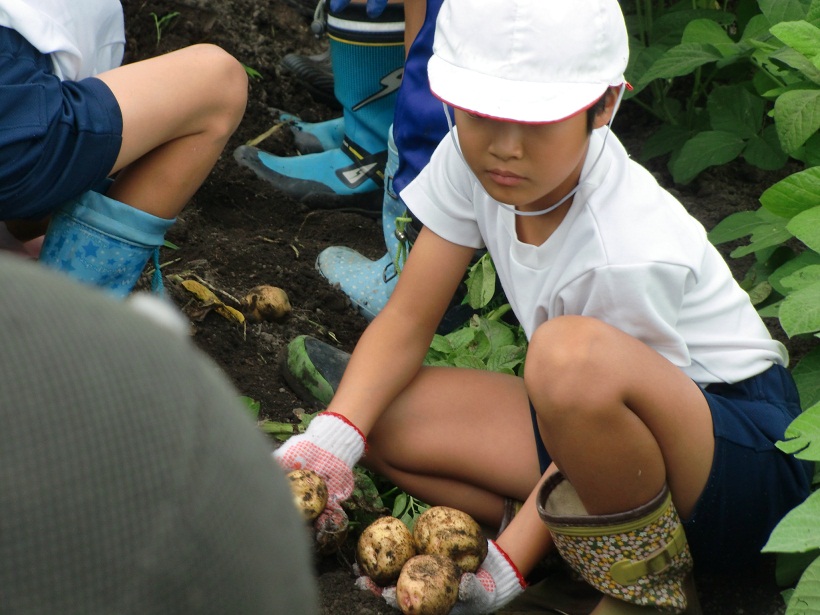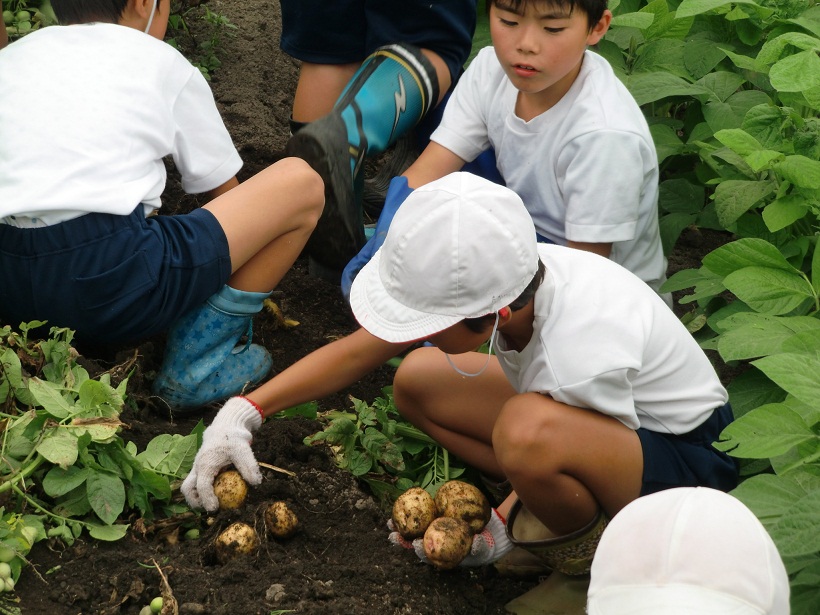 今日の1,2校時に農業支援員のご指導のもとジャガイモの収穫作業を行いました。恐る恐るジャガイモの茎を引っ張ってみると、大きなジャガイモが顔を出しまた。畑のあちこちから子ども達の歓声が聞こえてきました。掘ったジャガイモは大きい物と小さい物とに分別して、コンテナから泥のついたままビニルシートにあけて乾燥させます。ジャガイモはおいしいカレーの材料になったりジャガイモ料理に使います。作業終了後、畑の周りの土手で掘ったばかりの塩ゆでジャガイモも食べました。
