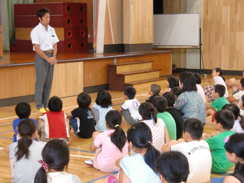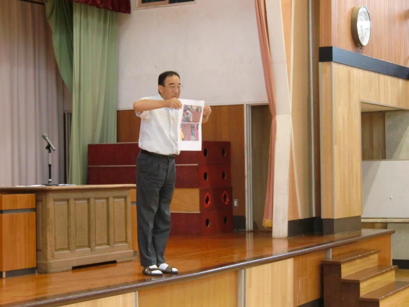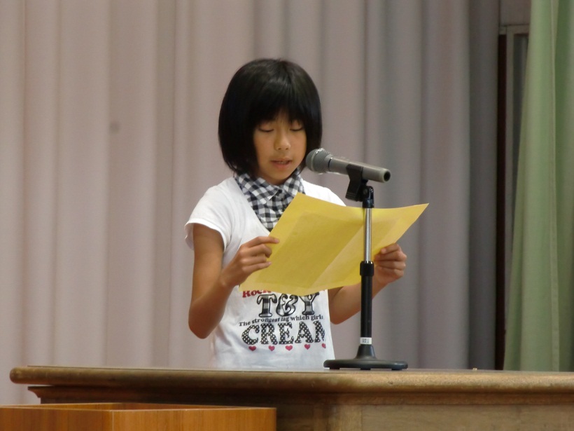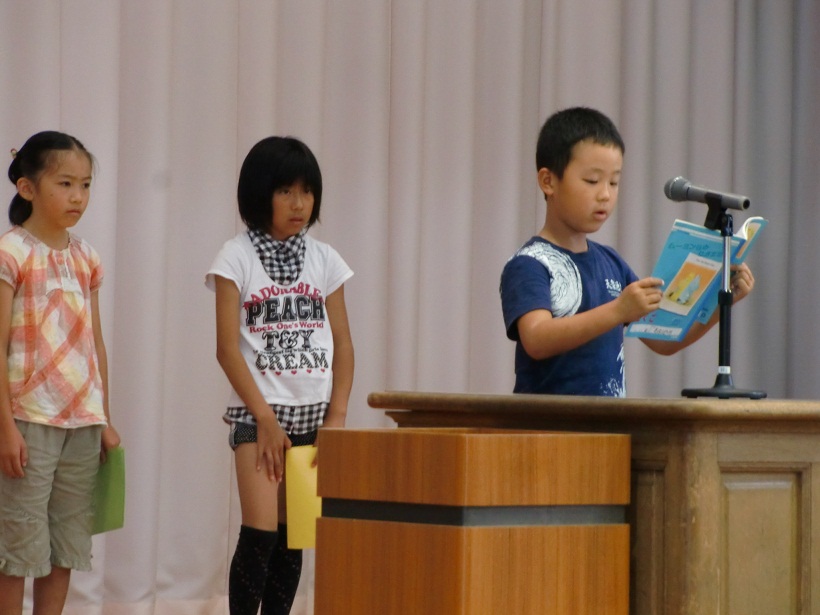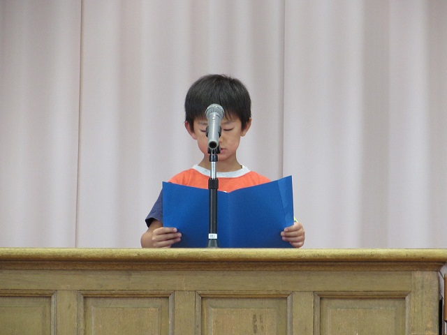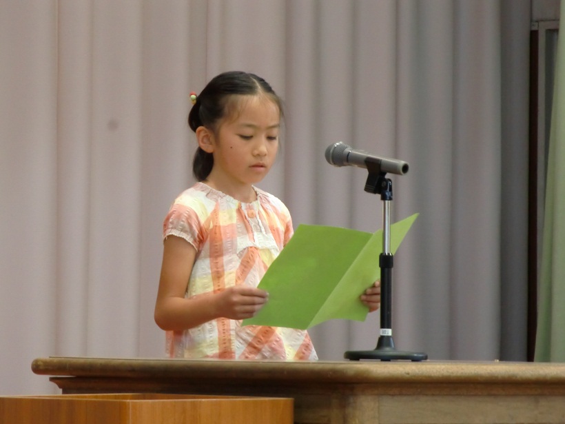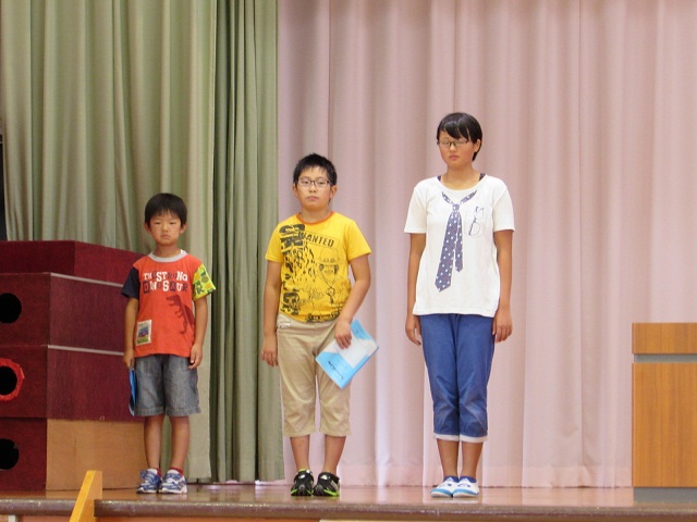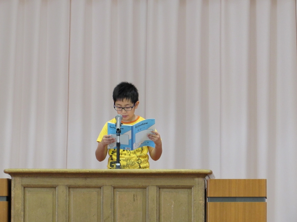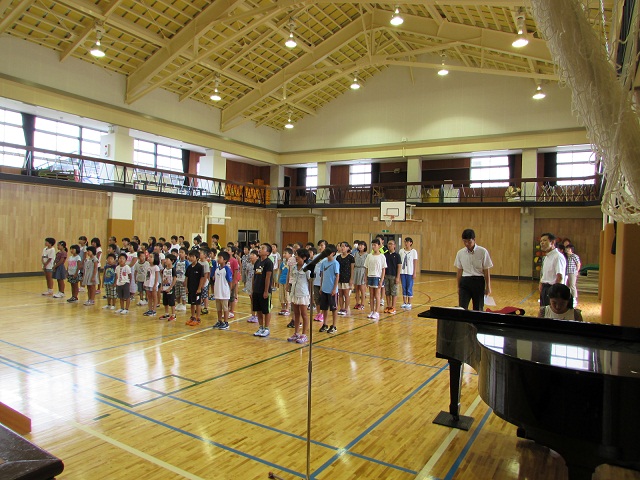 1,3,5年生の代表児童による1学期の反省と夏休みにがんばりたいことの発表の後、元気な歌声の校歌斉唱で終業式が終わり、生徒指導の先生から夏休みの安全な過ごし方について、体育主任からはプールの使用についてお話しがありました。