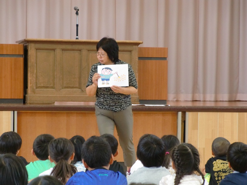 1~3校時によい歯の教室が行われます。5,6年生は1校時に3,4年生は2校時、1,2年生は3校時の時間に行われます。染め出しによる磨き残しのチェック、正しいブラッシングの仕方など歯科衛生士の先生からご指導がありました。