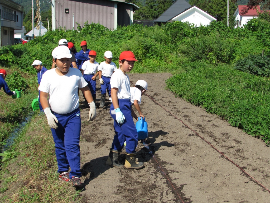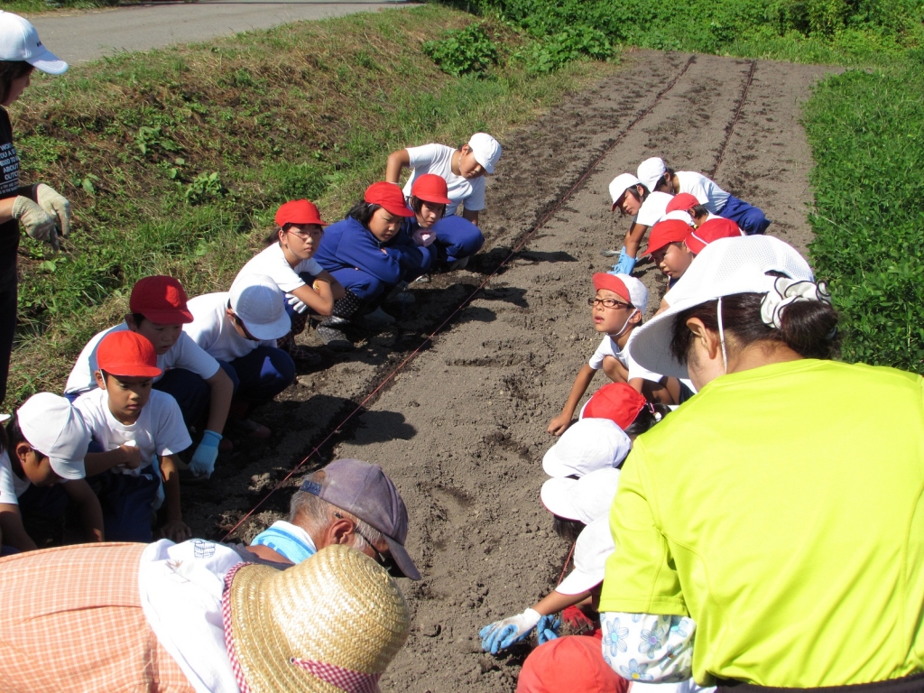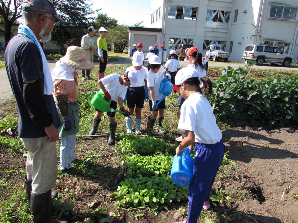 2014年9月4日 09時14分 3.4年生による農業科(秋野菜の種まき)が行われました。2人の農業支援員さんのご指導の下、今日はダイコンの種まきと白菜の苗の植え方を教えていただきました。ダイコンは11月に収穫してたくわんに白菜は地域の方のご指導によってキムチにして全校児童で食べます。