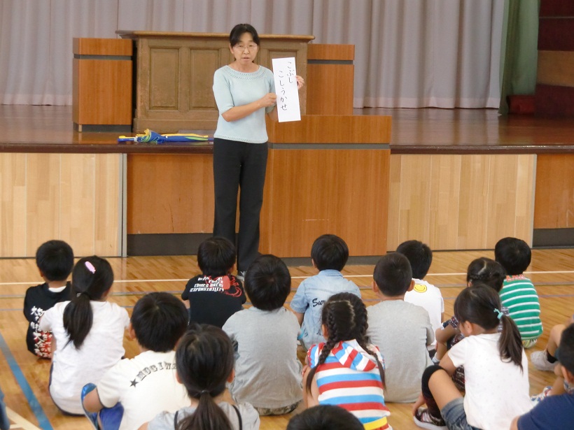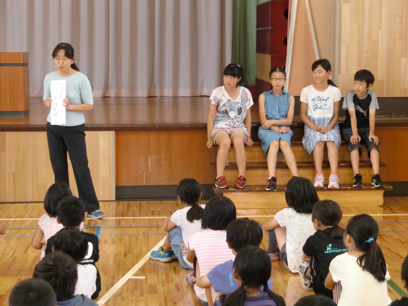 全校朝の会は、2学年担任のお話しは「江戸しぐさ」でした。「江戸しぐさ」とは江戸時代に上に立つ人の行動哲学のことです。「こぶしうかし」「かさかしげ」「うかつあやまり」「かにあるき」の4つのしぐさについてのお話しです。「こぶしうかし」とは電車などで席に余裕がある場合、こぶし一つ分腰を浮かしてずれて座るスペースを作ってあげることだそうです。江戸時代の「思いやり」や「マナー」の話しでした。子ども達は先生のお話に真剣に聞き入っていました。