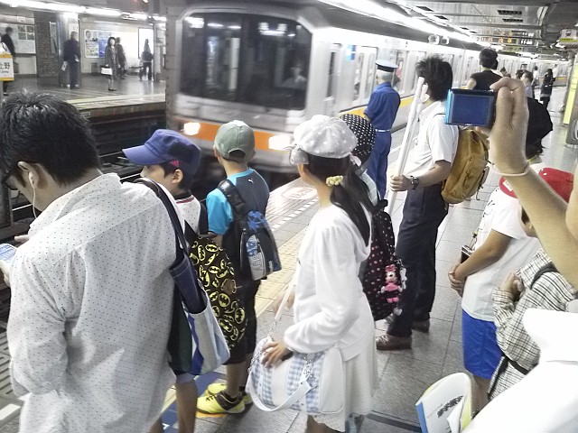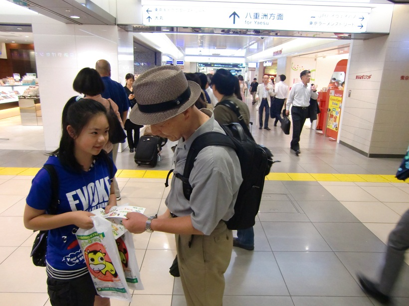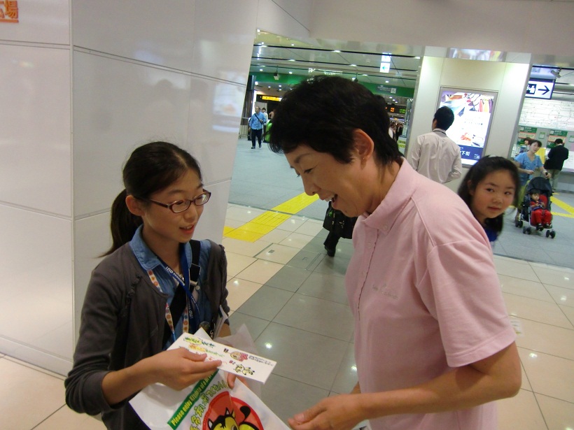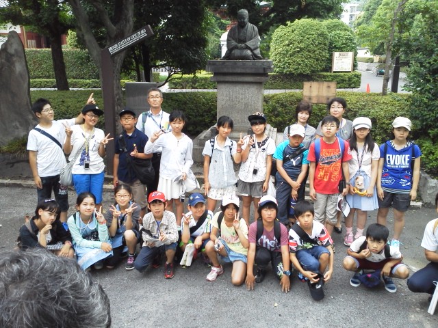 2014年6月25日 15時10分 修学旅行で、浅草寺を訪れました。喜多方の生んだ偉人、瓜生岩子刀自の銅像の前で記念写真を撮りました。その後、子どもたちが作成したパンフレット(会津や喜多方の紹介・PR用)を配る活動を行いました。受け取ってくださった方の中には、思わず涙ぐむ方もおられました。熱塩加納の子どもたちが持つ「純粋さ・ひたむきさ」に心を打たれたのかもしれません。