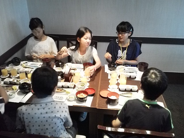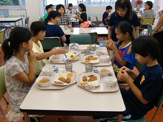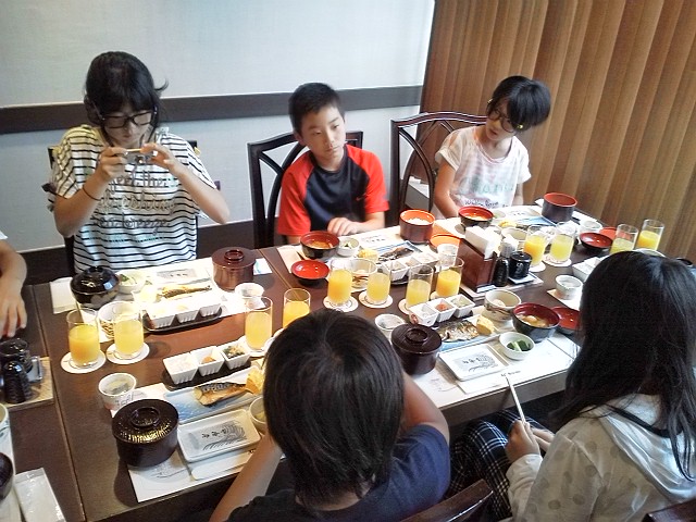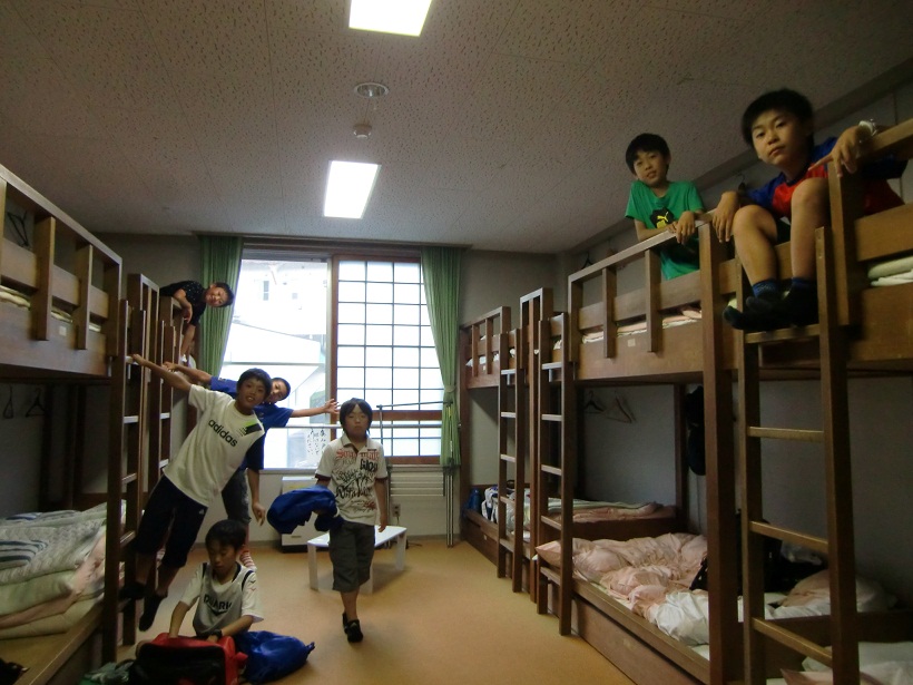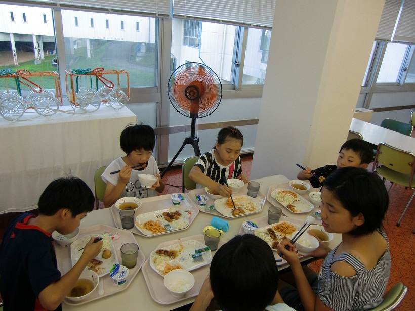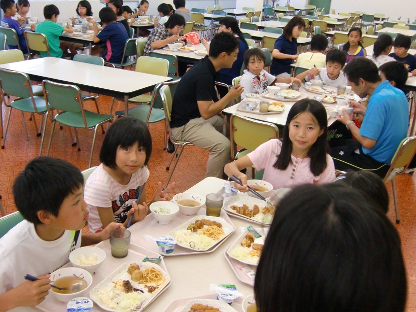 午前のフィールドワークが無事に終了し、会津自然の家での夕食と部屋での様子です。全員元気です。夕食は、たこ焼き・ハムカツ・スパゲッティー・サラダ・焼き肉・ヨーグルトととても豪華でおいしそうでした。
