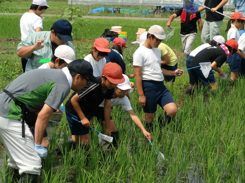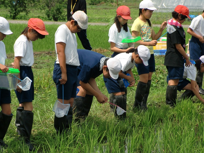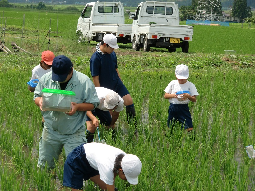 今日、第3回田の除草活動と田んぼの生き物調査が行われました。農業支援員さんのお世話になり、東京と福島から全農の3名の職員が来られ、田んぼの生き物を採取しました。「ゲンゴロウ」「ミズカマキリ」「コオイ虫」「ヤゴ」等たくさんの生き物を探すことができました。その後、3回目の除草活動を行いました。さすがに3回目だけあって上手に除草作業を終了することができました。