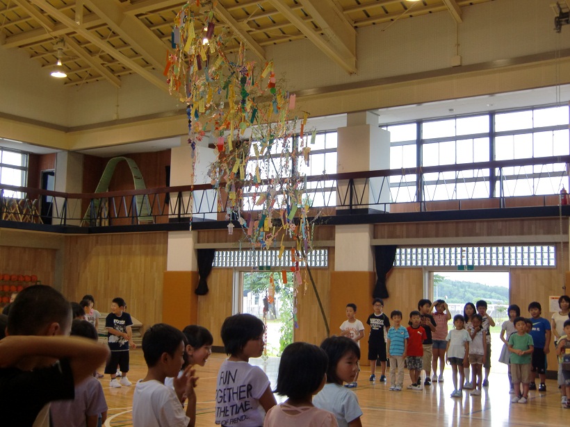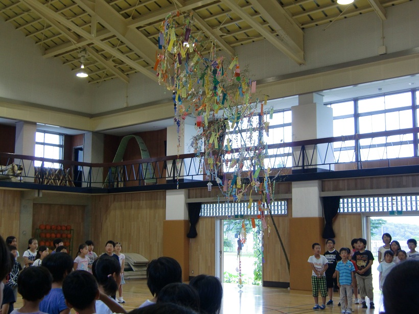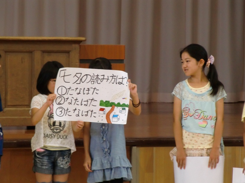 朝の活動の時間に七夕集会がありました。体育館には、78名の子ども達一人一人が書いた願い事の短冊が鮮やかに飾られました。1~6年生の「願い事の発表」、放送・集会委員会による「七夕クイズ」、全校児童で「七夕さまの歌」を歌い楽しい集会が終わりました。