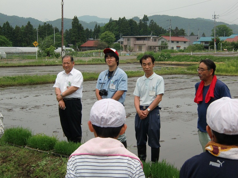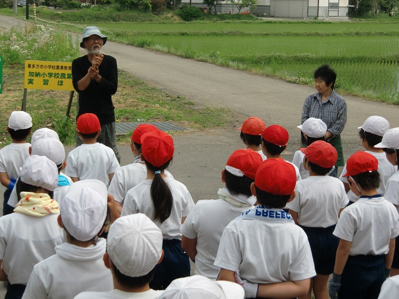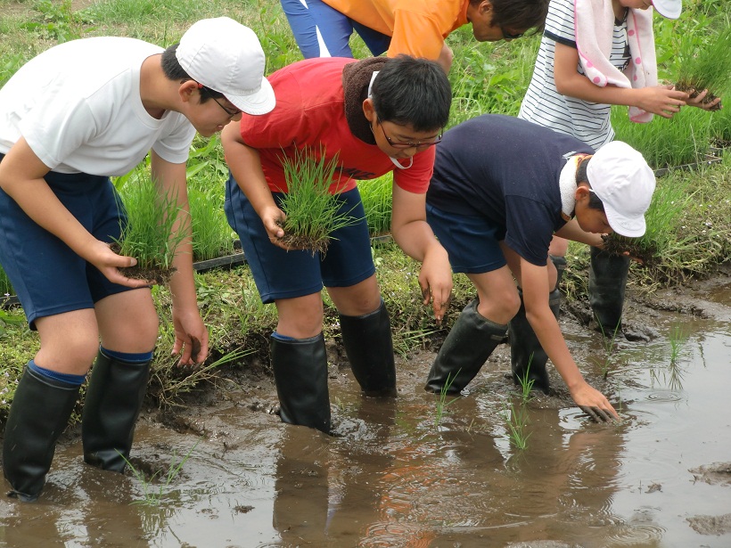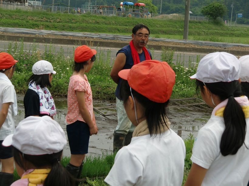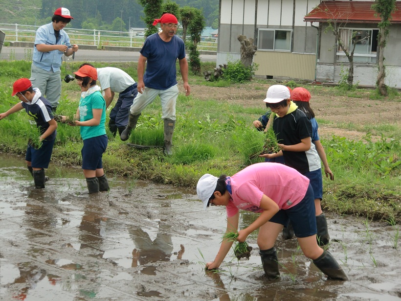 3,4校時は5,6年生による田植えです。農業科支援員の方やJA会津いいでの営農指導員の方、そして子ども達のおばあちゃんも手伝いに来ていただきました。支援員の方からこれからの稲の育ち手方、営農指導員の方からは稲の植え方を教わりました。6年生は昨年も経験をしているのでとても上手です。5年生のお手本として真剣に取り組んでいました。この稲は、餅米になり加納小フェスティバルの餅つきのための餅米や一人暮らしの高齢者の方への赤飯になる予定です。