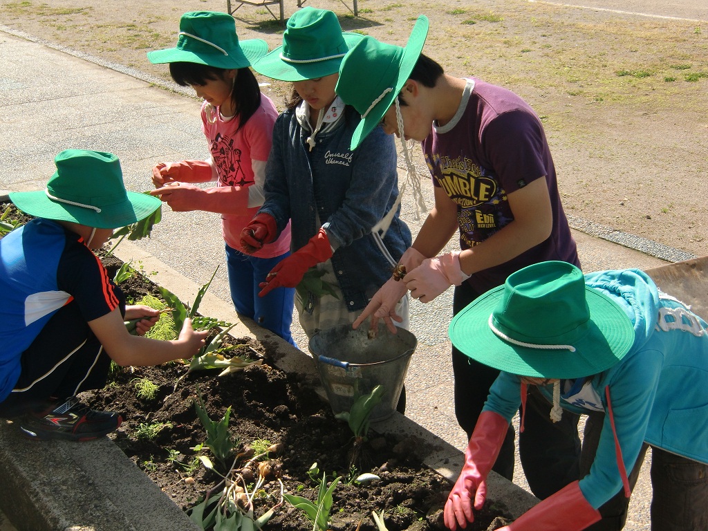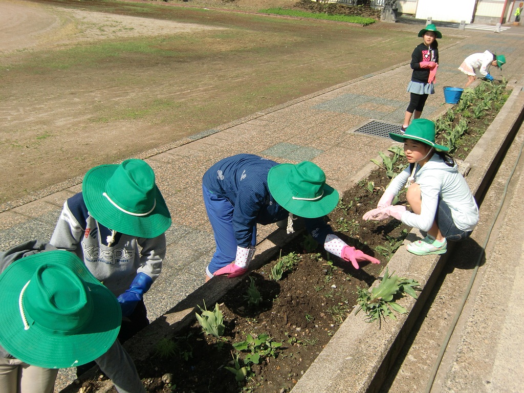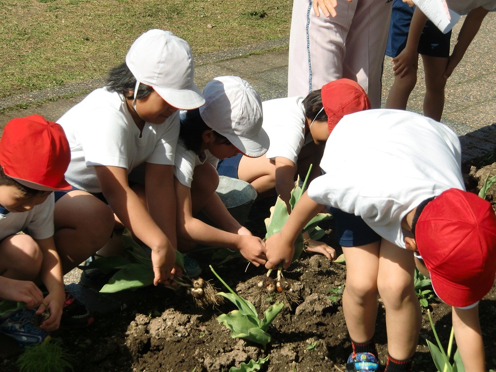 今日、朝の活動の時間に全校生でチューリップの球根をぬきました。4月から綺麗な花を咲せてくれたチューリップの球根を子ども達が一つ一つ丁寧にぬきました。この後は、6月2日には花壇の花植えを実施します。ベゴニア・サルビア・インパチェンス・トレニア・マリーゴールド等の苗を植える予定です。