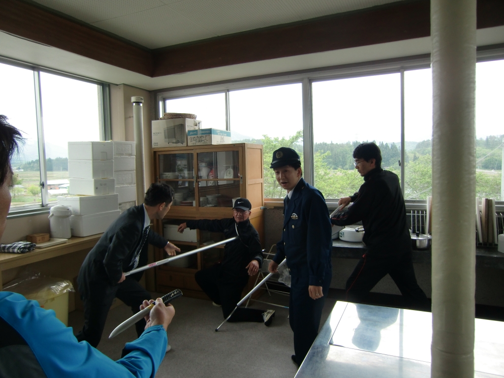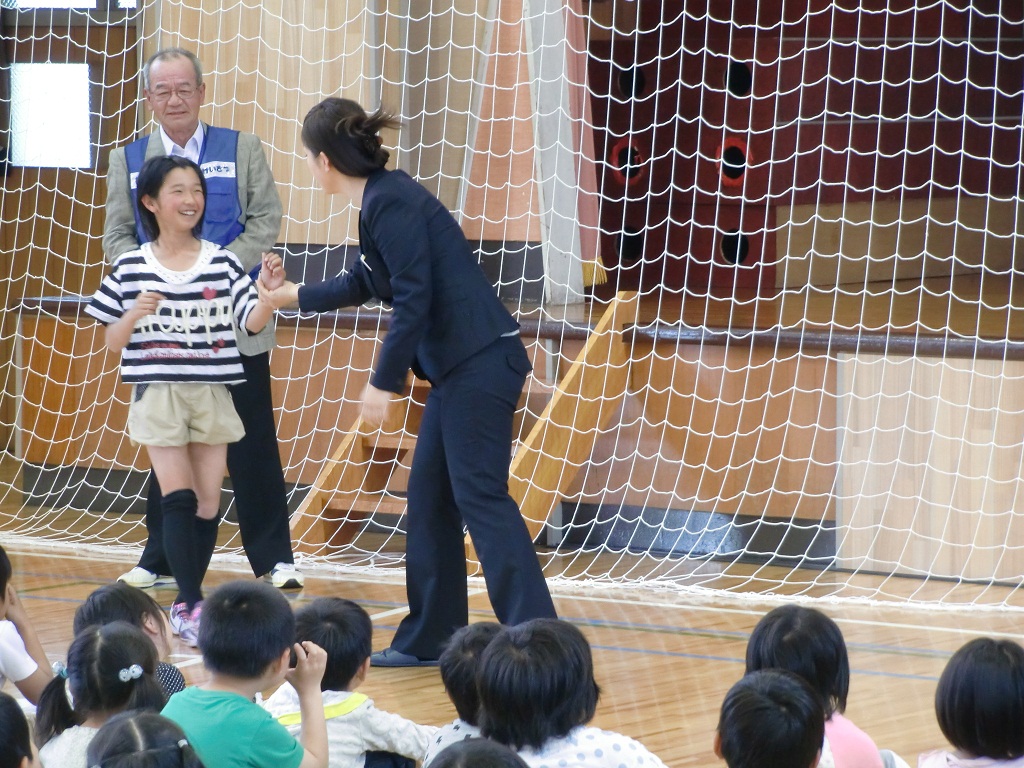2014年5月15日 11時52分 今日の3校時に「防犯教室」が行われました。スクールサポーターの渡部さん、喜多方警察署から佐藤少年警察補導員さん、野矢駐在さんの3名においでいただきご指導がありました。「い、か、の、お、す、し」と実際に声をかけられたら自分自ら「気付いて」「考えて」「行動」するという実践を交えたお話しも聞くことができました。子ども達は真剣に3人の先生方のお話を聞いていました。