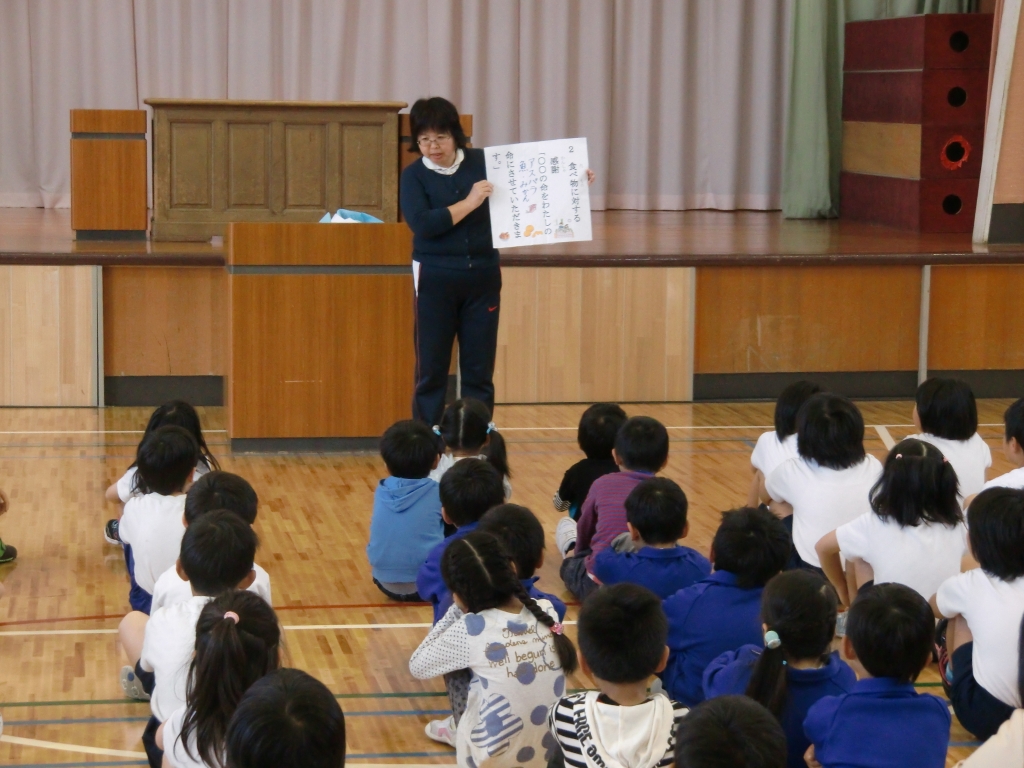 今日の朝の会は、5年の先生のお話でした。「いただきます」「ごちそうさま」の意味についてです。「いただきます」は私の命のために動植物の命をいただく感謝の意味を表しています。「ごちそうさま」は「馳、走」はしるという漢字が2つ入っていることが私に命がけで食材を探すために走り回って探して下さる人への感謝の意味を表していると言うお話しでした。最後に「いのちをいただく」内田美智子さんの本の朗読で終わりました。