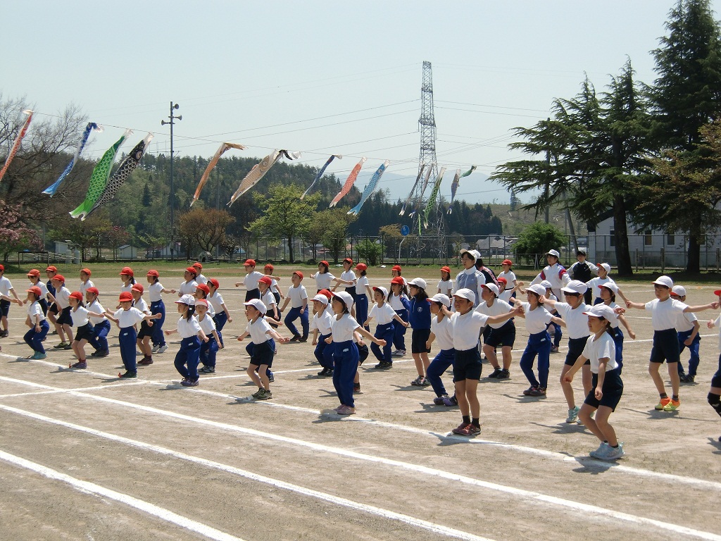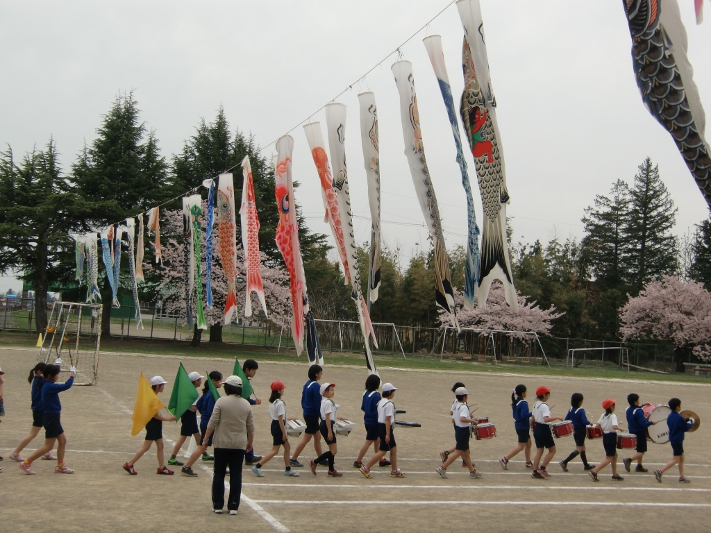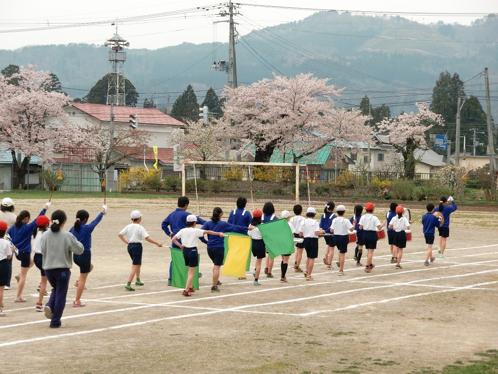 校庭の満開の桜とこいのぼりのもと、いよいよ運動会の練習が始まりました。今日の4校時は4.5年生による鼓笛の練習です。昨年度の曲に1曲新曲「海女ちゃんのテーマ」が加わり元気いっぱいの練習をしていました。